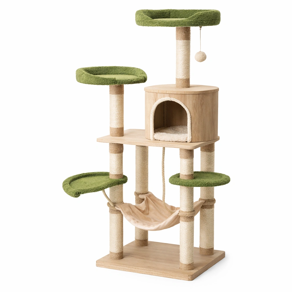 Características: Cinco niveles con casa para gatos, hamaca de tela y bolas colgantes.