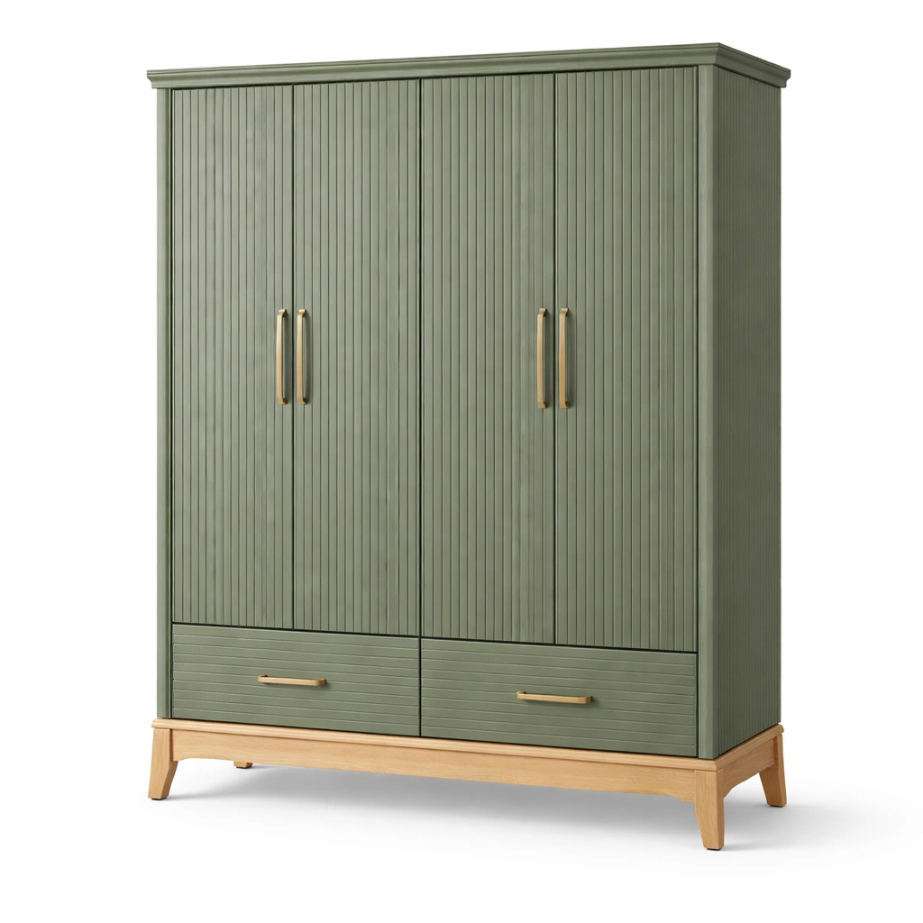 Material: Cuerpo de madera MDF, patas de madera maciza de roble, tiradores de acero inoxidable.