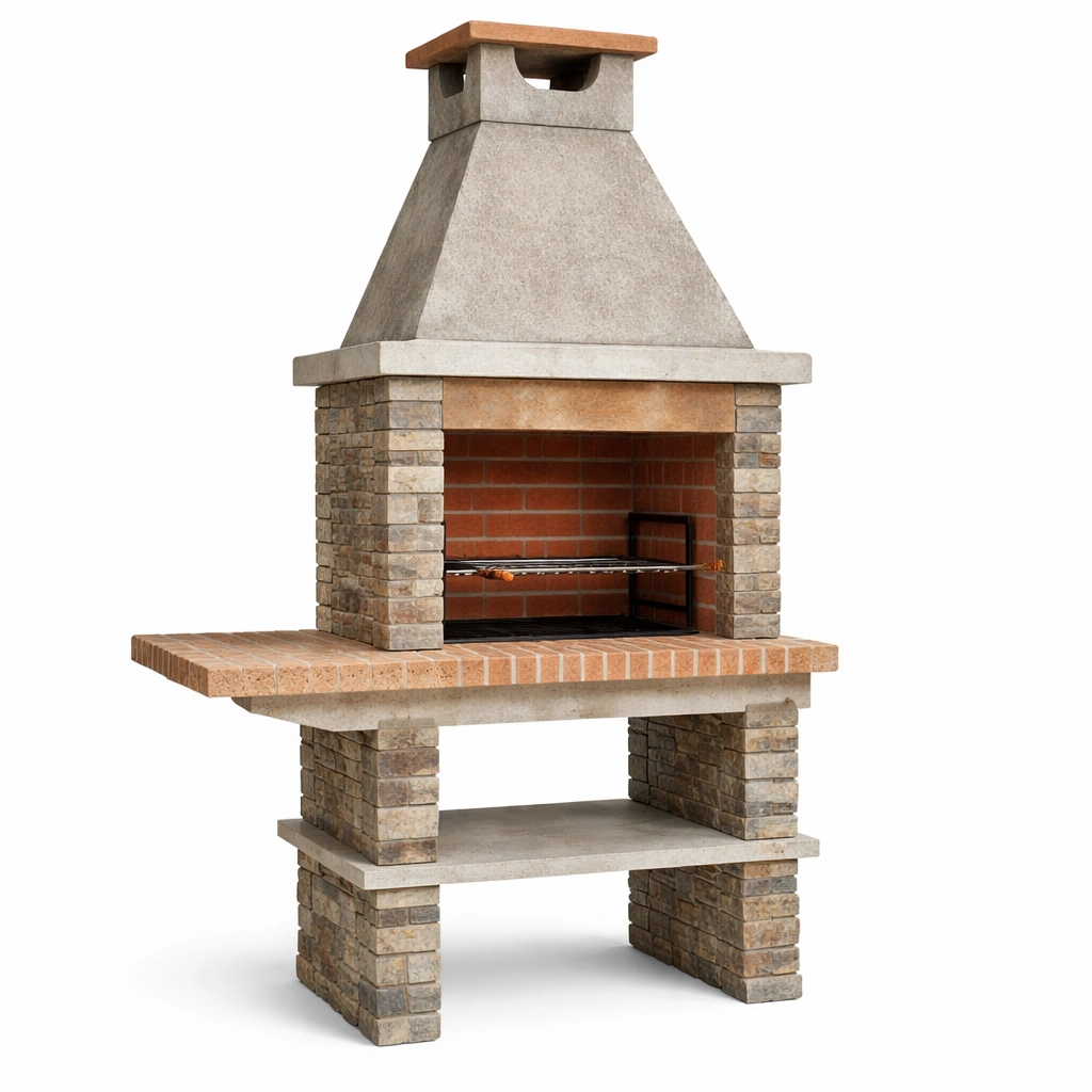 Barbacoa de ladrillo refractario y cemento para uso exterior. Mide 120 cm de largo, 70 cm de ancho y 200 cm de alto, con un peso de 250 kg. Incluye parrilla de acero resistente al calor. Para asar alimentos.