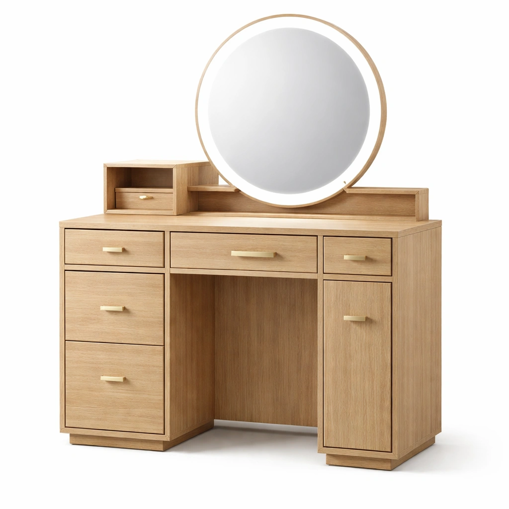 Tocador de madera de roble con espejo redondo y LED 160x45x75 cm